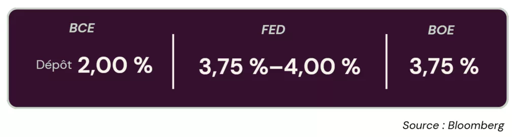 → Les banques centrales sont restées immobiles, mais contraintes. La Fed maintient une posture restrictive, sans aucune baisse anticipée à court terme. La BCE reste sous pression inflationniste, avec au moins deux hausses de taux anticipées d’ici fin 2026.