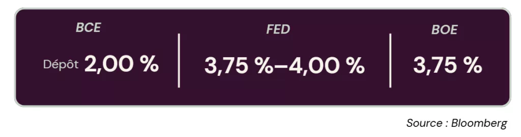 → Trésorerie et placements : Dans ce contexte, la pause BCE risque de comprimer les rendements court terme des dépôts à terme et placements monétaires. Il peut être pertinent de profiter de la fenêtre actuelle pour bloquer des dépôts sur 3 à 6 mois, puis de pivoter progressivement vers des maturités légèrement plus longues afin de capturer le carry résiduel tout en maintenant une certaine flexibilité.